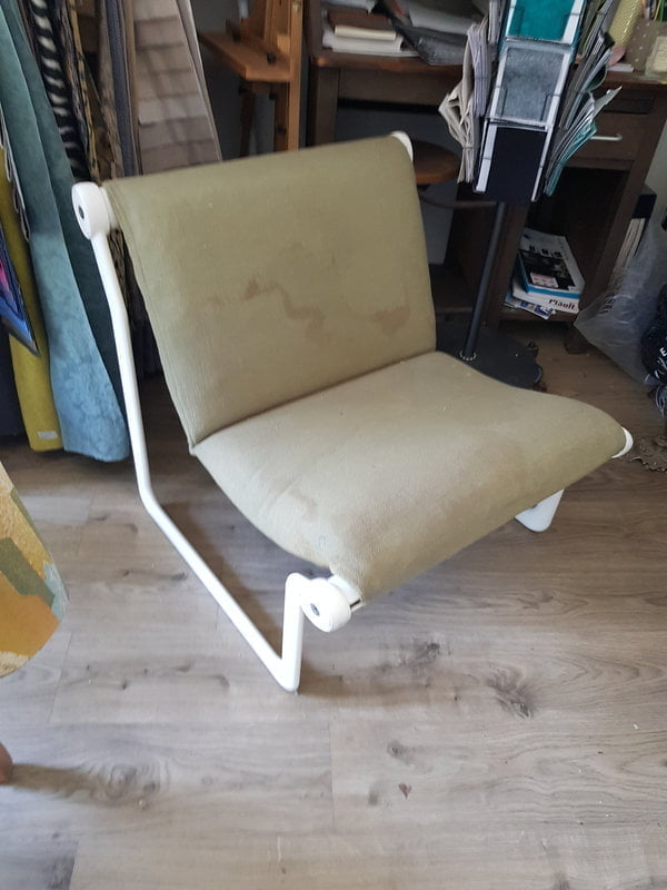 Avant   Fauteuil slind par Hannah et Morrison pour Knoll , 1980’s   Après     Réfection totale   Tissu anti taches aqua passiflore de Angely Paris   [...]