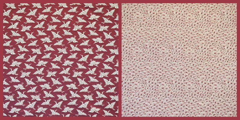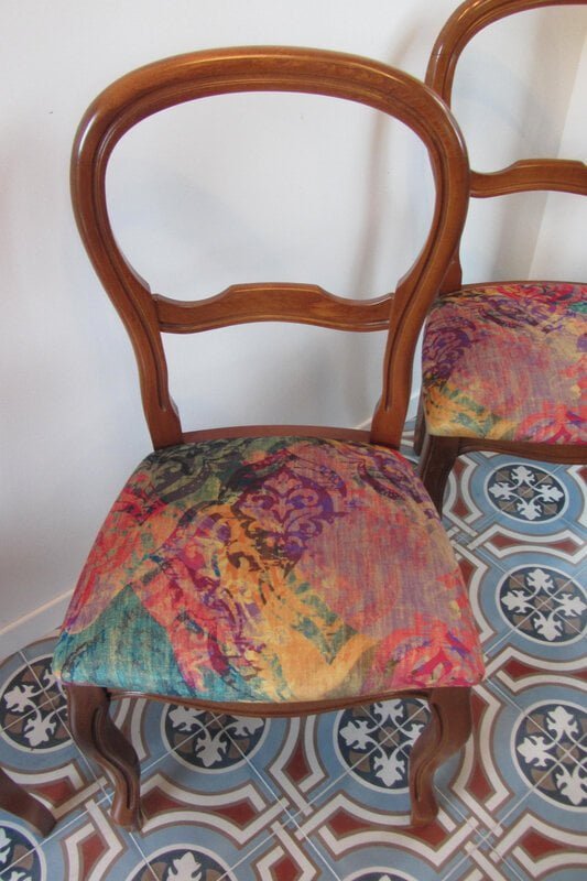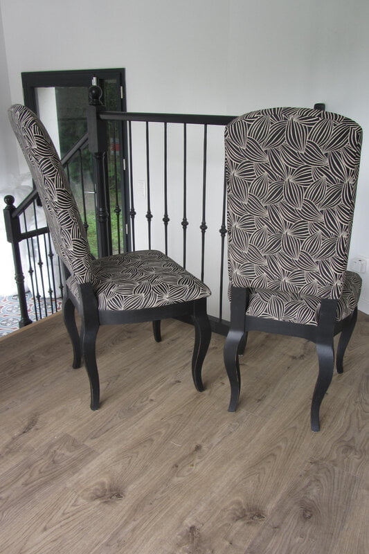 Avant   Chaise à retapisser   Après   Assises retapissées et dossiers houssés   Tissu réversible fourni par la cliente , pas de référence   *