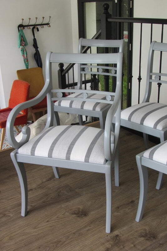 Avant Chaises à laquer et à retapisser   Après   Farrow&Ball Hardwick White   retapissées avec le rythm de cgez Casadeco tissu en voie de suppression   [...]