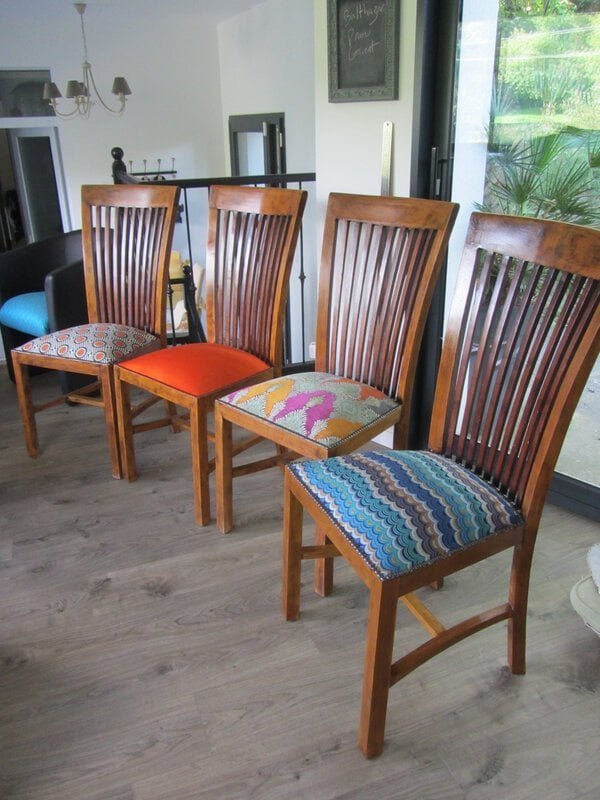 Avant     Chaises à transformer en non déhoussable   Après     Voici les 4 chaises retapissées    Housse sur mesure pour le dossier   Tissu fourni par [...]