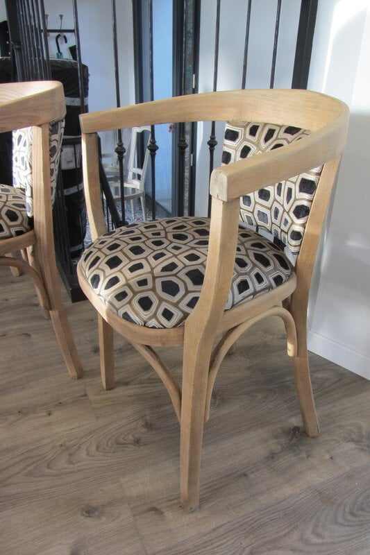 Avant   Fauteuil bridge à retapisser entièrement et à décaper   Après   Bois brut , naturel   Tissu savanna de chez Harlequin   Clous alu brossé   [...]