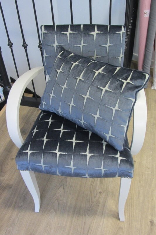 Avant   photo perdue  🙁     Après   Entièrement retapissé       Passepoil navy , passementeries Ile de France   Velours issoria midnight Harlequin     [...]