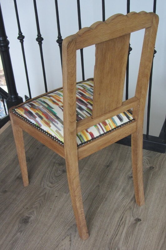 Avant   Bridge à retapisser et à revernir   petite chaise pour l’accompagner   Après   retapissé avec le Holywell Stripe  O&L   Vernis   Petite chaise retapissée [...]