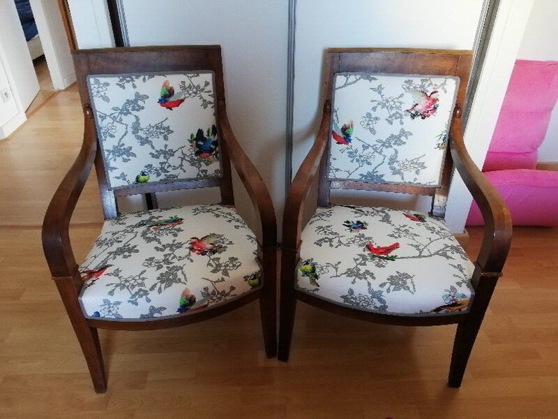 Avant   Paire de bridges à retapisser    Après   Retapissés   Tissu Hortus encens Lelièvre   Assises refaites pour un meilleur confort   galon reps des passementeries [...]