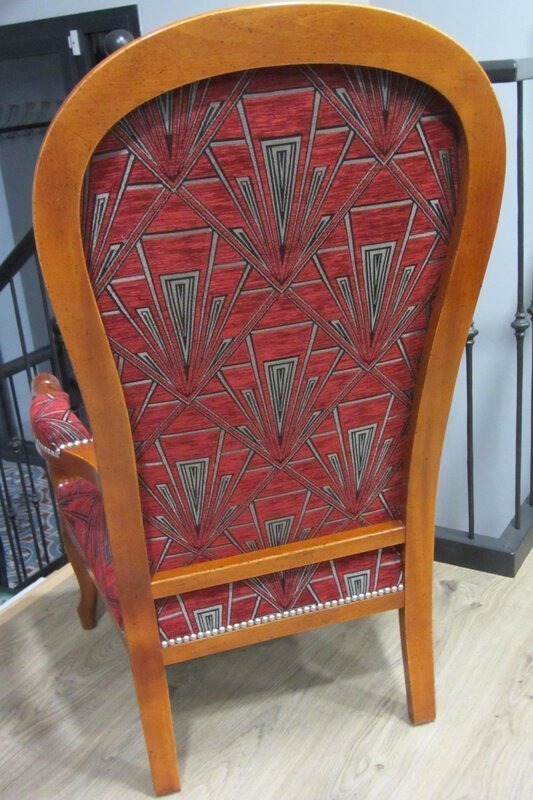Avant   Voltaire à retapisser   Après   Retapissé et profil avant changé   Finition clous alu brossé   Inspiration art déco pour ce tissu qui existe dans [...]