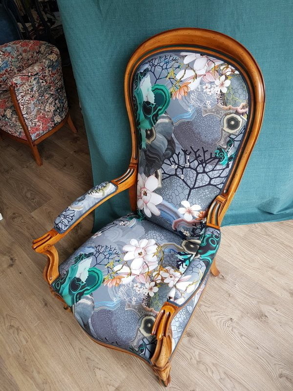 Avant   Voltaire à retapisser totalement plus passage chez l’ébéniste   Après   Retour de chez l’ébéniste   Tissu Azores Prestigious textile , aqua clean 100000 tours [...]