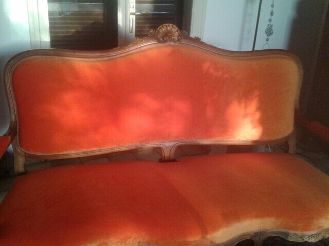Avant   Banquette Louis XV à retapisser entièrement   Après   Réfection totale   Velours nabab mandarine Lelievre   Galon PIDF   Très lumineux    La preuve au [...]