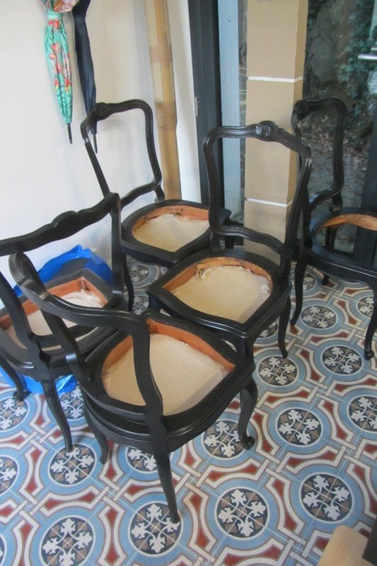 Avant   Série de 6 chaises Louis XV dégarnies et repeintes par ma cliente   Après     Une des 6 de dos     Galon reps   [...]