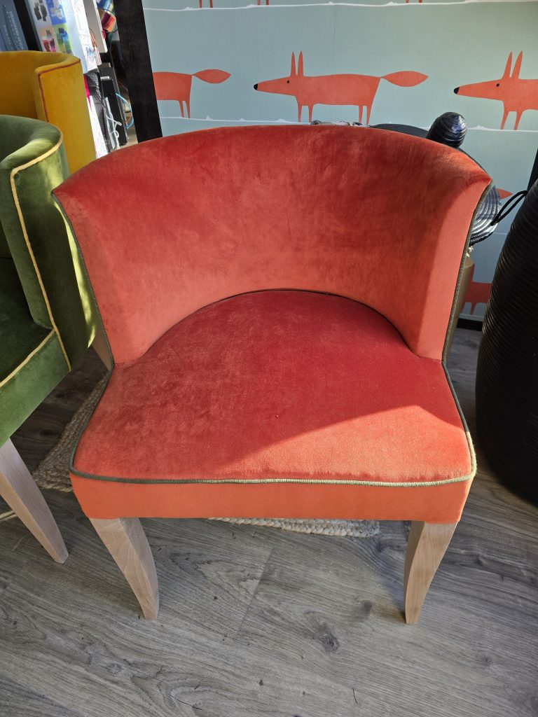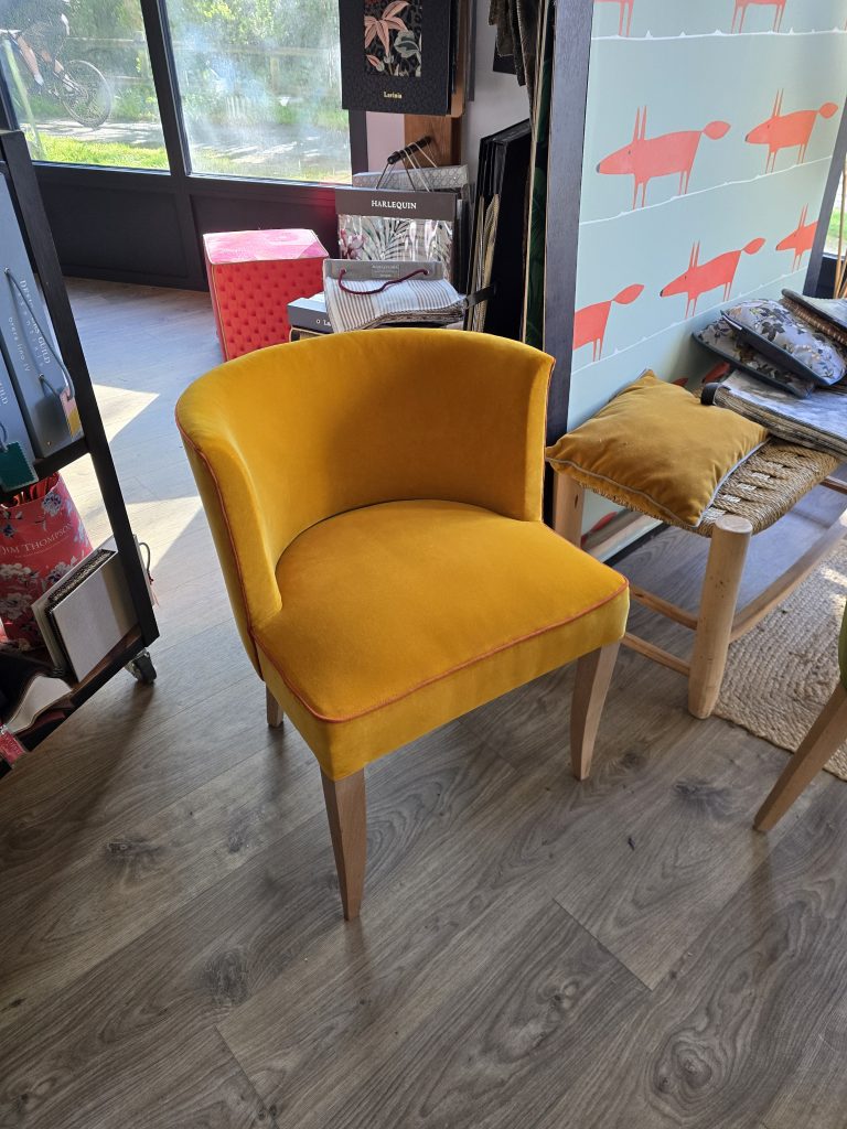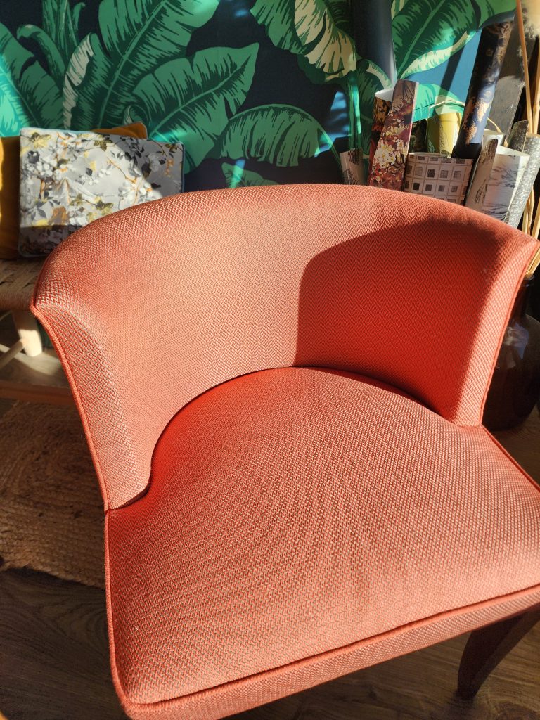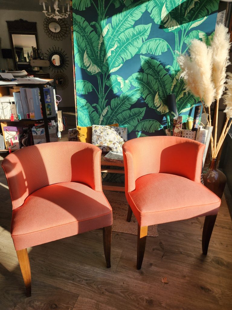 Le choix a été fait de mixer les coloris de passepoil pour mieux souligner la ligne des fauteuils et les pieds poncés et laissés bruts