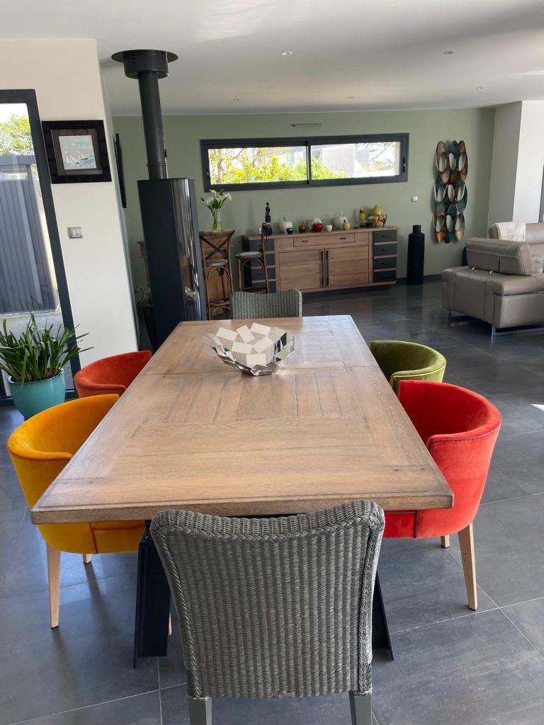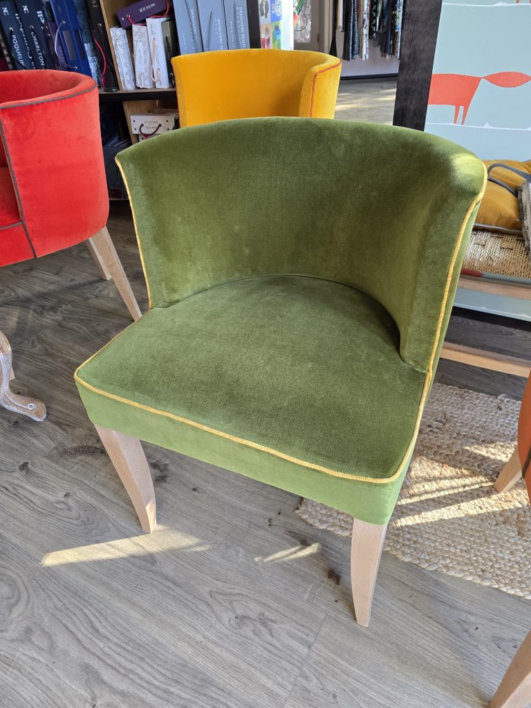 Pour l’ambiance salle à manger , les bridges sont recouverts du velours gedeon de chez Casal , un velours aqua clean , ici le coloris Kaki