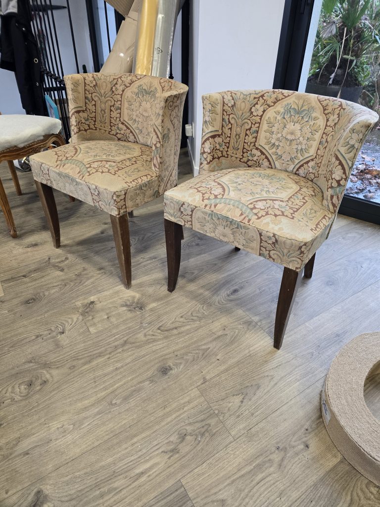 Six fauteuils années 30/40 de style bridge à retapisser , quatre d’entre eux autour de la table et deux dans le salon , mais pas dans la même maison