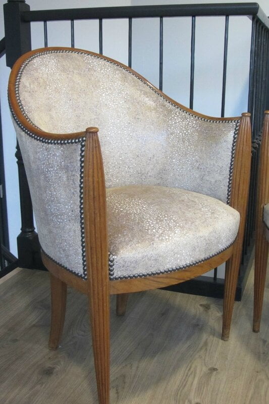 Avant   Paire de fauteuils années 30 à retapisser entièrement   Après   Retapissés , garniture traditionnelle     Le dos avec le fleur d’écailles Karin [...]