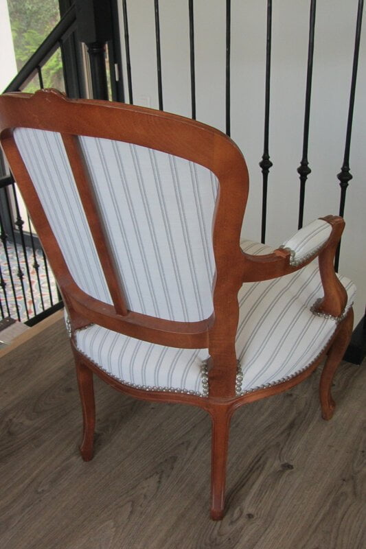 Avant Cabriolet Louis XV à retapisser totalement   Après   Retapissé   clous sable   Tissu indoor /outdoor ASCOT STRIPE PERENNIALS anti taches et très résistant [...]
