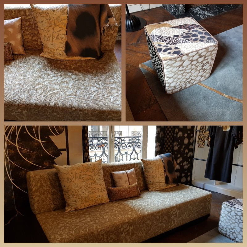 Avant   Cabriolet à retapisser , assise à refaire   Après   Retapissé   Tissu Kenzo , réversible   Galon reps bis   Magnifiques reflets dorés   [...]