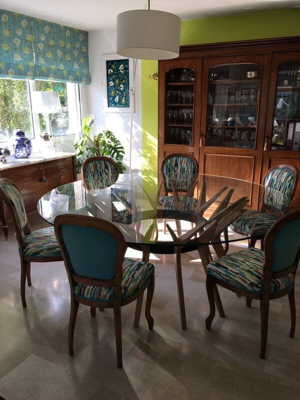 Avant 6 chaises Louis Philippe à retapisser   Après   Une des six    Retapissées    Double passepoil Houlès   Velours cosmos outremer Lelièvre pour le dos [...]