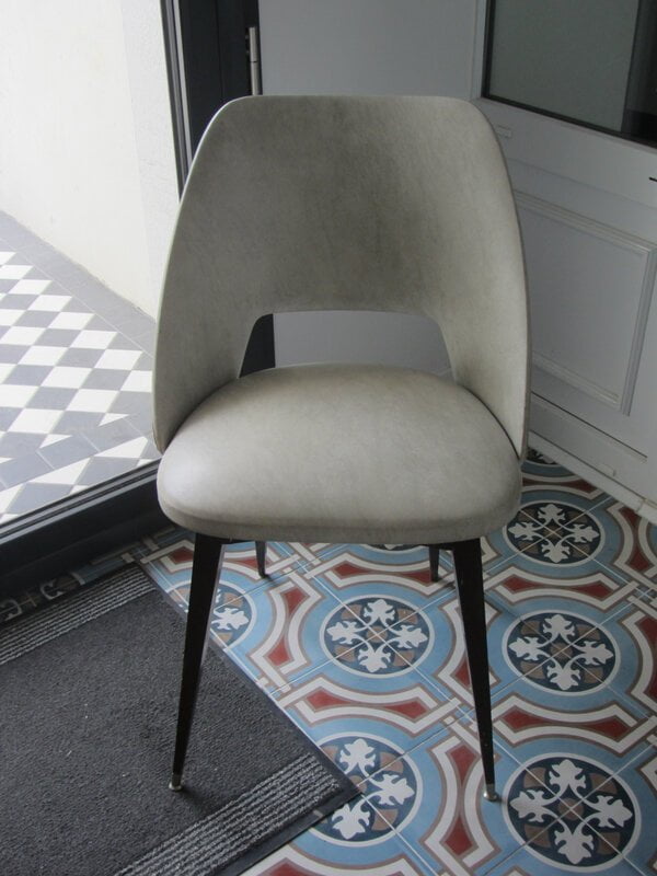 Avant     Fauteuil années 50/60 à retapisser   Après   Retapissé avec le carapace de Karin Sajo   Pieds teintés , bleu/noir mélange maison   Dos cousu main [...]