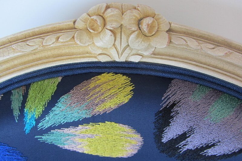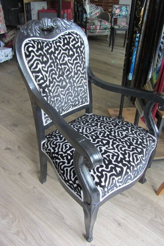 Avant   Bridge à retapisser   Après      Totalement dégarni , laqué en noir et retapissé   Tissu butterfly parade opalin de chez Lacroix     [...]
